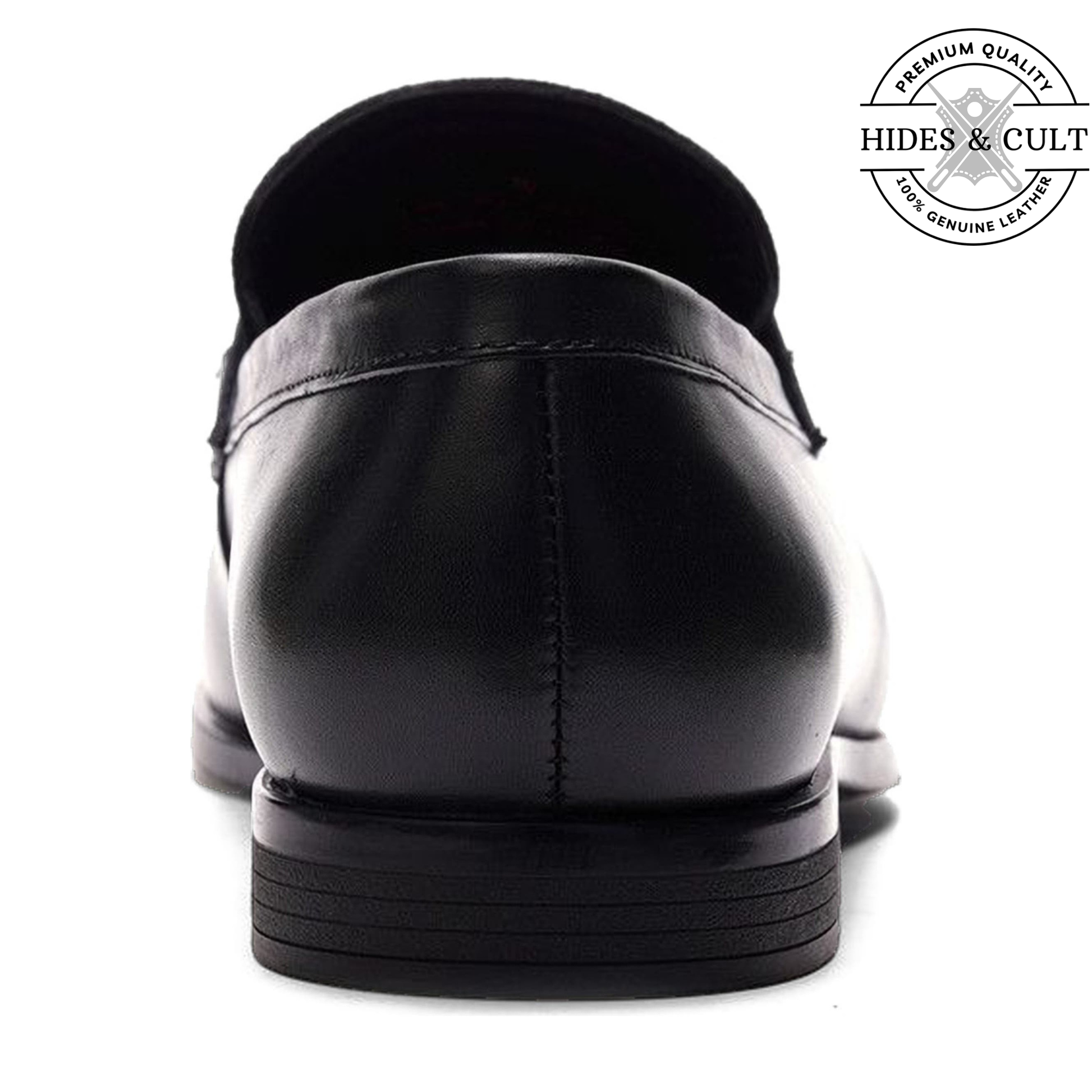 Crafted in smooth leather from our tanneries, Hides&Cult presents the new Black Buckled SlipOn Leather Moccasin Loafers in Premium Cow Hide, enhanced by premium leather inserts. Their sturdy, comfortable sole is ideal for long days, while the side stitching reinforces the solidity of the structure.