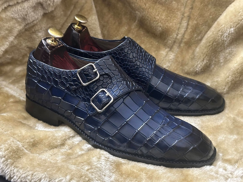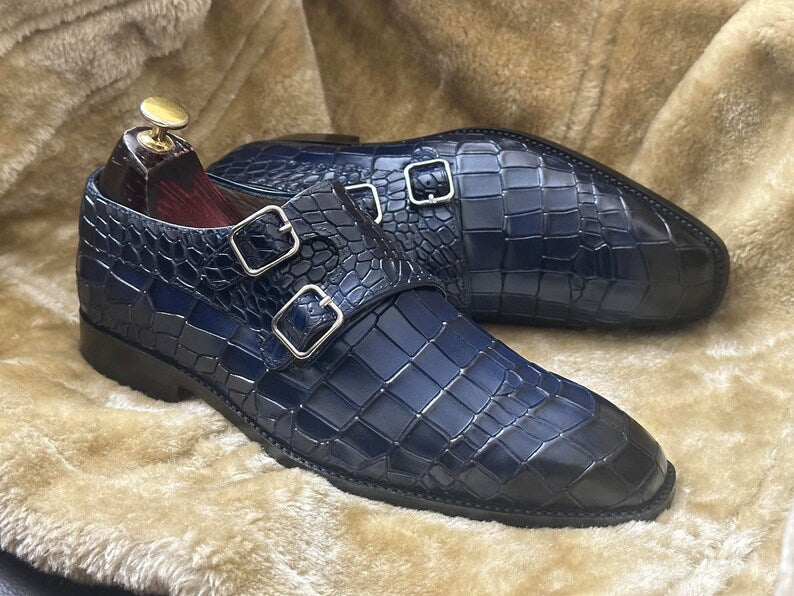 Crafted in smooth leather from our tanneries, Hides&Cult presents the new bespoke pure handmade alligator croco textured deep blue genuine leather double monk strap shoes for men, enhanced by premium leather inserts. Their sturdy, comfortable sole is ideal for long days, while the side stitching reinforces the solidity of the structure.