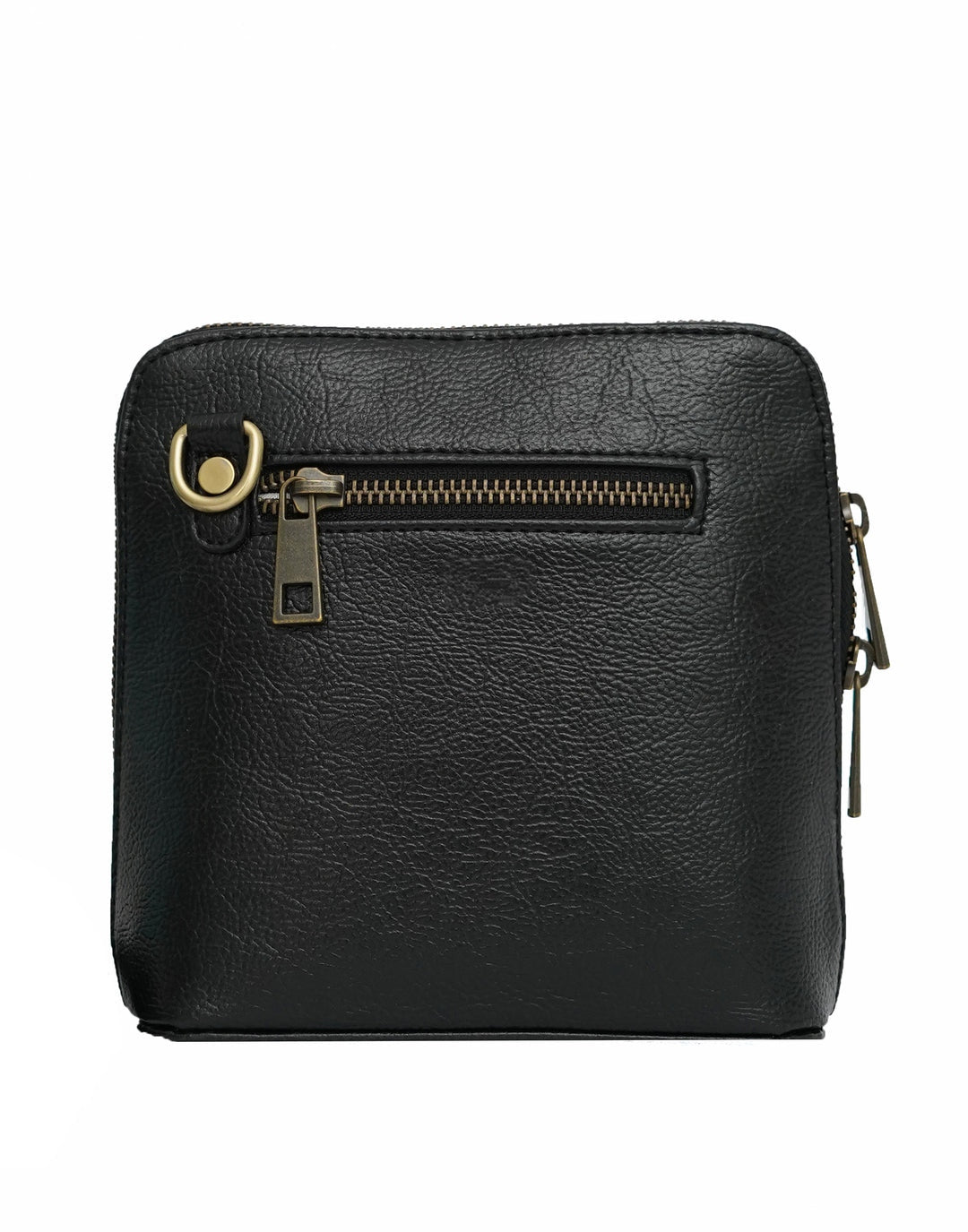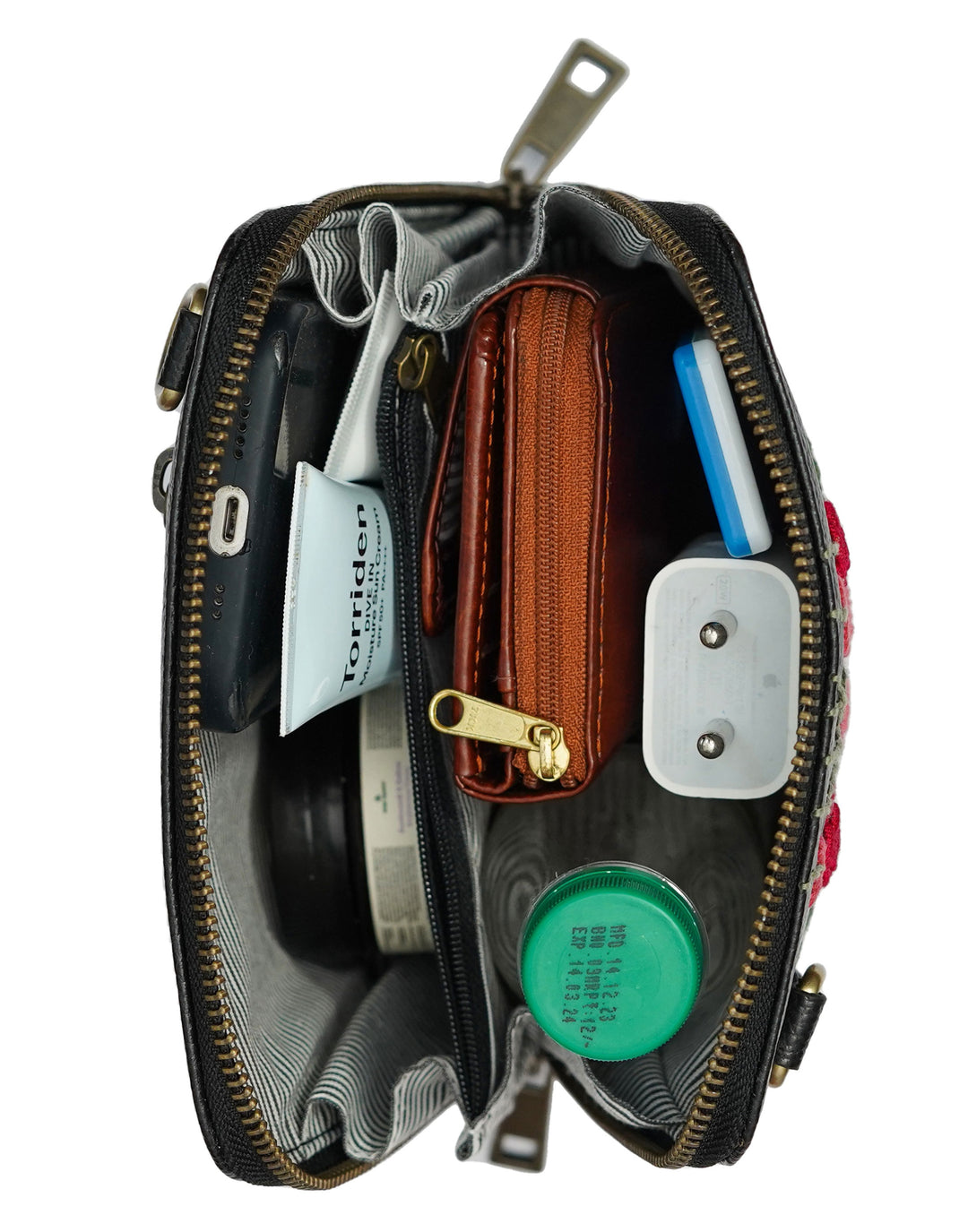 Handcrafted Black - Red Rosebuds Embroidered Genuine Leather Square Sling Bag