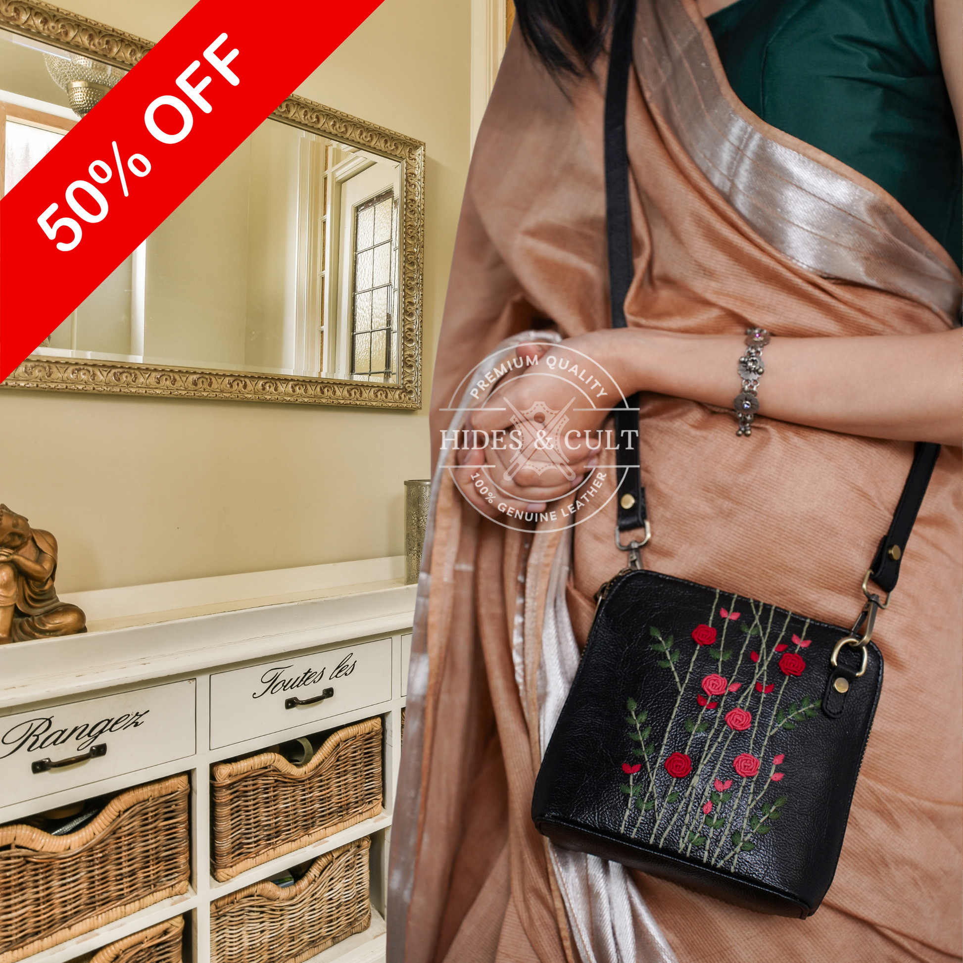 This genuine leather sling bag features intricate hand embroidery of beautiful red rosebuds. Its square shape adds to its functionality and versatility, making it a stylish and practical accessory for any occasion. Get ready to make a statement with this unique and expertly crafted bag.