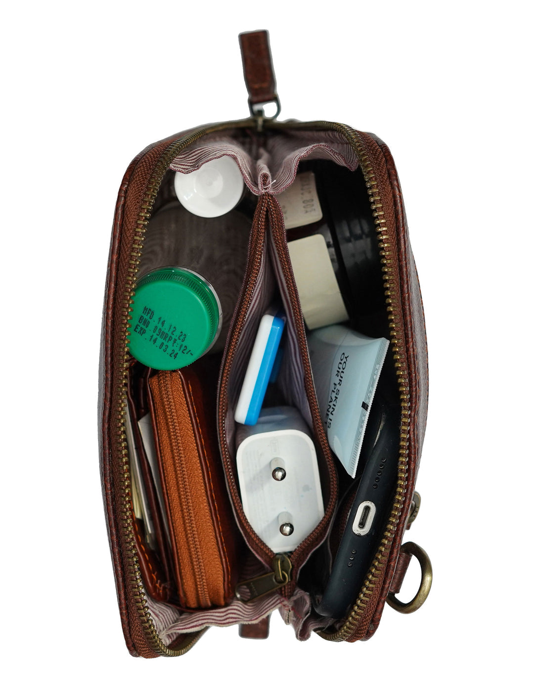 Handcrafted Brown - Red Rosebuds Embroidered Genuine Leather Square Sling Bag