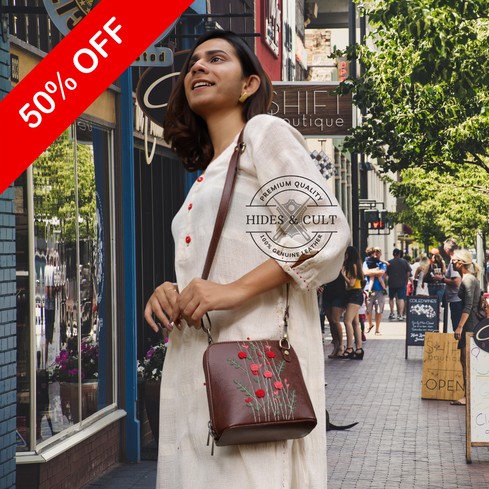 This genuine leather sling bag features intricate hand embroidery of beautiful red rosebuds. Its square shape adds to its functionality and versatility, making it a stylish and practical accessory for any occasion. Get ready to make a statement with this unique and expertly crafted bag.