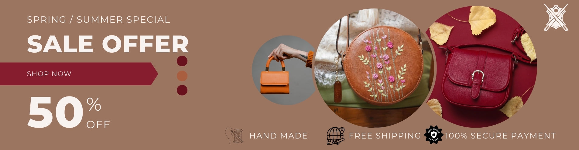 Handcrafted Brown - Red Cornfield Embroidered Round Genuine Leather Sling Bag